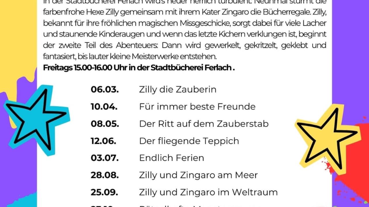 Ein zauberhaftes Jahr in der Bibliothek Ferlach. In der Bibliothek Ferlach beginnt ein besonderes Jahresabenteuer: Neunmal im Laufe des Jahres treffen wir uns, um gemeinsam in die magische Welt von Zilly und Zingaro einzutauchen.